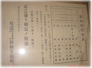 | 「娼妓場」いわゆる公認の遊郭ですが、その料金表がこれです。拡大図はこちらをクリックしてください。 昭和13年当時の物価を知りたいところです。「一晩平日で10円というのは、安いですか高いですかねーF郷さん。」 戦前の当時は、遊郭は公認でしっかりと料金もきまっているのですから、素人さんでも「安心してそこに行けます」。 赤字の国の歳入を建て直す為に、「公認の遊郭」を再度つくってもいいんじゃないですか。 この「お宝」もどこで手にいれたか、「ご主人」のコレクションの一つです。 「アンテイークギャラリー茜」には正直言って本当に「驚き」ました。皆さんも是非お近くに行く用がありましたら立ち寄ってください。そして俺たちの意見に「賛成」「反対」して下さい。ご意見お待ちしております。 「アンテイークギャラリー茜」へのアクセスは上の「最終回」をご参照ください。 それでは、取材にご協力戴きました「おじいちゃん」「ご主人」「奥さん」「若大将」にお礼を申し上げてこのページを終わりたいと思います。 「ありがとうございました」 |