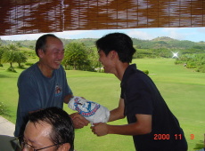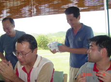 | 結果はベスグロが91であとは似たり寄ったりのスコア−でした。順位の決め方は行きのバスで団長の一声で決まりましたねやはり。 ルールはこうです。グロスの良かった順に番号をふり、その番号をふった紙を抽選でひき3位、2位、1位をきめるという、ゴルフをやらずに、いきなり抽選会をした方が早く効率的なサイパン方式がとられました。 その恩恵に預かったのが上の3名です。特に写真下の優勝者U山氏の嬉しそうな顔が光っていますね。 明日は、団長お勧めのマニャガハ島の特集です。水中写真もありいいっすよー。 |