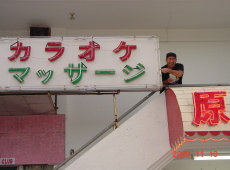 | マニャガハ島に行く前にチョッと寄り道をしましょう。そうですサイパンで一番の繁華街「ガラパン」にちょっとね。 どでかい免税店の「DFSギャラリア」(写真左)までは、ホテルからタクシーで無料で行けます。 「DFSギャラリア」からガラパンの中心地へはおよそ500mくらい北上して左折した所にあります。 真中の写真は変な看板ですね。カラオケとマッサージなんて直接的につながりませんよね。この謎は3日目の夜に明らかにされるのだが、申し訳ございません。一般のページでは書けない内容です。この連載が終わりましたら、会員専用ページに大いに書きます。 その節は、色々な情報をお寄せくださいね、F郷さん。 写真右の奥の建物が「第一ホテル」です。この写真から第一ホテルまで約200mくらいありますが、なかなか到着できません。 なぜかって、マッサージチックな店がいっぱいあって10mごとに「説明員」がチラシをもって寄ってくるんだぜ。 熱心なF郷氏やH川氏は真剣に説明を聞くもんだからますます時間がかかりましたとさ。 |