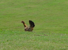 | H部長の部屋は隣の隣でしたがバルコニーからすぐ丸見えです。 エレベーターホールから部屋の棟の間には景色の良い渡り廊下?があります。 ゴルフ場にいたニワトリ。 写ってませんが、この親鳥の後ろには5匹くらいのヒヨコがくっついていてかわいかったので撮影したのですが。 |